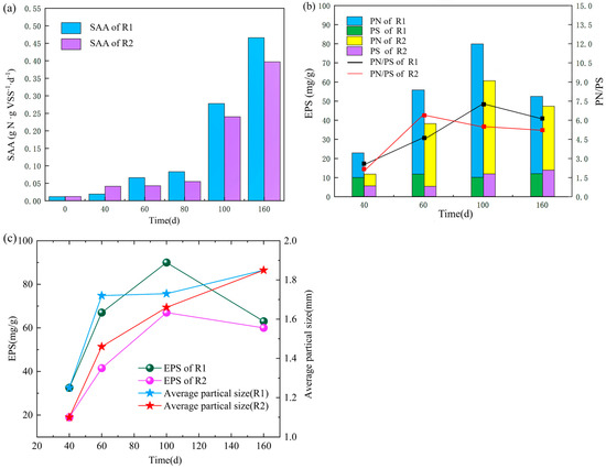 Changes of specific anammox activity (SAA) in R1 and R2 during the reaction phase (a); content of extracellular polymeric substances (EPS) and its fractions of protein (PN) and polysaccharide (PS) (b); relationship between average particle size and extracellular polymeric substances (EPS) during sludge granulation in R1 and R2 (c).