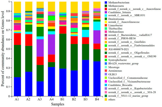 The microbial communities of the sludge samples were analyzed by high-throughput 16S rRNA amplicon sequencing. During the run, 10 g of sludge samples (numbered A1, A2, A3, A4, B1, B2, B3, and B4) were taken from the bottom of the two reaction zones on days 1, 30, 120, and 160, respectively. Samples were submitted to Shanghai Meiji Biomedical Technology Co. (Shanghai, China). Then 515FmodF (5′-GTGYCAGCMG CCGCGGTAA-3), and 806modR (5′-GGACTACNVGGGTWTCTAAT-3′) were used for PCR amplification and library construction, and gene sequence analysis was performed on the Illumina Miseq platform. The Silva database (SSU128) was used to perform operational taxonomic unit (OUT) clustering of species with more than 70% sequence similarity, which has a 70% comparison threshold.