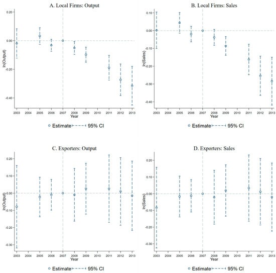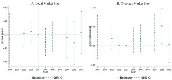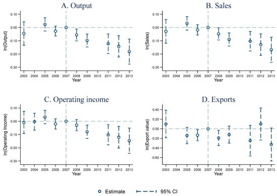 where αt captures the differential changes between firms in the treatment and control group before and after the implementation of SEL in 2003–2013. Following previous literature [], we select 2007 as the baseline year (one year before the implementation of SEL).
