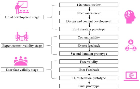 We developed our website’s content and user interface using an iterative user-centred design approach [,,] which gathered input from subject matter experts and potential end-users to improve and finalise the prototype’s design and content. In our study, we recruited medical specialists and medical officers at every stage of website development. They were mainly from three tertiary medical centres in Malaysia. The study was conducted between April 2022 and September 2022. The process was divided into three stages: (1) the initial development stage, (2) the expert content validity stage, and (3) the user face validity stage. Figure 1 summarises the development process.