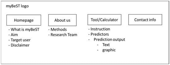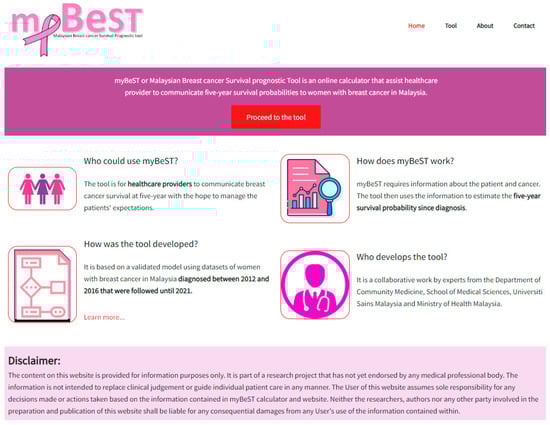 We named the web-based prognostic tool Malaysian Breast cancer Survival prognostic Tool, abbreviated as myBeST. The website can be accessed via the URL: http://mybestpredict.com/ (accessed on 21 September 2022). The website contains four pages, namely, the homepage (Figure 3), tool page (Figure 4), about page (Figure A1), and contact page. Headings and descriptions of each content on the website are shown in Table 1.