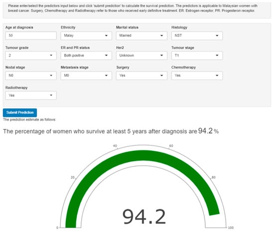 The tool was designed using the R Shiny web interface (Figure 4) and deployed in the cloud-based server, https://www.shinyapps.io/ (accessed on 2 April 2022). The tool consists of three components: (1) instruction, (2) input predictors, and (3) prediction outputs. The instruction describes how to use the tool and the definition of the predictors’ input. The second component requires users to enter (age at diagnosis variable) or select input with drop-down options necessary to calculate the prediction. The prediction output component of the survival probability is displayed in two ways: (1) by the text of the five-year survival probability percentage and (2) by a meter gauge graph to visualise survival probability. The entered patient’s parameter is not stored in our database. For example (Figure 4), a 50-year-old Malay married woman with grade II, both ER and PR positive, invasive carcinoma (NST) diagnosed at T1, N0, M0 stage, who received surgery, chemotherapy, and radiotherapy has a 94.2% percentage to survive at least five years after diagnosis.