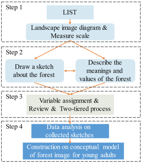 Four steps were taken to develop a conceptual-image model of the interaction between the young adults and the forest in Changsha, Central China (see Figure 1). Firstly, a diagram of the landscape-image-sketching technique was constructed. Secondly, the respondent-perception measurement scales for forest landscapes were developed. Thirdly, data on landscape-image sketches were analyzed, according to the respondent-perception measurement scale. Finally, the conceptual-forest-image model for young adults was constructed.