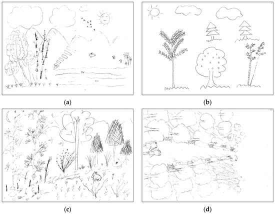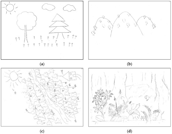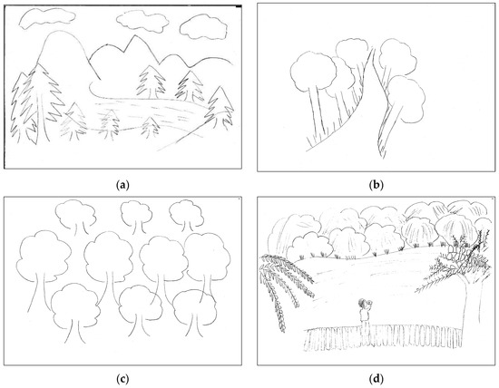 The results showed that ‘objective scene’ ranked first (76.34%) (Table 2), representing natural landscape elements which dominated in the sketches, such as grasses, trees, rivers, and mountains (Figure 4a). A ‘surrounding place’ was second (17.56%), in which a road was painted in the center of a sketch with both sides having distinctive tree-trunks, indicating the respondent was walking on the road (Figure 4b). A ‘single object’ was in third place (5.34%), with, for instance, only a pattern of trees, which could be observed in the sketches (Figure 4c). A ‘scenic place’ was the lowest, accounting for only 3.82%, and usually showed the objective landscape elements, for example, grasses, trees, lakes, and bridges, and a person standing on the bridge and looking far away, to exhibit the respondent’s own viewpoint (Figure 4d).
