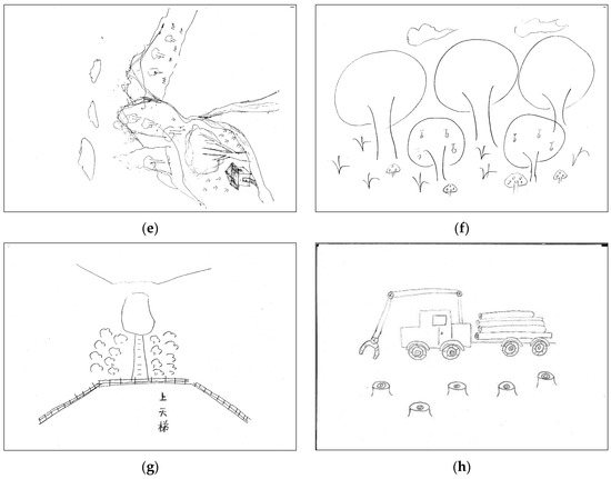 A ‘scenic view’, such as ‘objective scene’ or ‘scenic place’ depicted a beautiful forest sketch, such as the foreground and background from the ‘sideways view’ and ‘distant view’ (terrain), respectively (Figure 5a). ‘Forest structure’ was represented in the horizontal and vertical distribution of layers, including the trees, shrubs and ground covers in a sketch (Figure 5b). An ‘ecological system’ referred to an idealized objective scene, including a diversity of plants and animals, for example, grasses, trees, rabbits, birds, and snakes (Figure 5c). A ‘recreational space’ usually indicated a ‘surrounding place’ for the public recreational activities, in which the trail for a walk in the forest was painted in a sketch (Figure 5d). A ‘life world’ referred to the settlements around a forest, such as houses in the forest (Figure 5e). The ‘natural resources’ were generally exhibited by lots of non-timber resources on the ground inside a forest, for example, bamboo shoots, and mushrooms under some trees (Figure 5f). A ‘symbolic place’ was usually represented by single objective landscapes, for example, an ancient tree or a symbolic landscape in a sketch which usually left a deep impression on the viewers. In the sketches, the close-up view was often used to represent the symbolic one, in the case of Tianmen Cave in Tianmen Mountain National Forest Park, Hunan (Figure 5g). In addition, a ‘forestry operation’ referred to the operational method or processes of the forest industry, such as forest harvesting (Figure 5h).