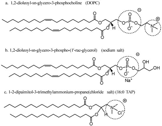 Industrial nano-scale carbon black (CB, >95% purity) purchased from a carbon black factory in Jinan, China. Neutral phospholipids DOPC, negatively charged phospholipids DOPG, and a positively charged lipid 16:0 TAP, were kindly provided by Dr. Jiang of Shandong University []. The schemes of the molecular structures of lipids are displayed in Figure 1. Sucrose and glucose (analytical reagent) were purchased from Sinopharm Chemical Reagent Co., Ltd. (Shanghai, China). Ultrapure water (Synergy UV, Millipore, Bedford, MA, USA) was used.