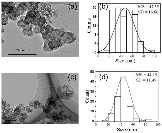 TEM images (a,c), and histogram and Gaussian fit of the size distribution (b,d) of CB (a,b) and MCB (c,d) particles. MS indicates the mean size and SD means the standard deviation (n = 100).