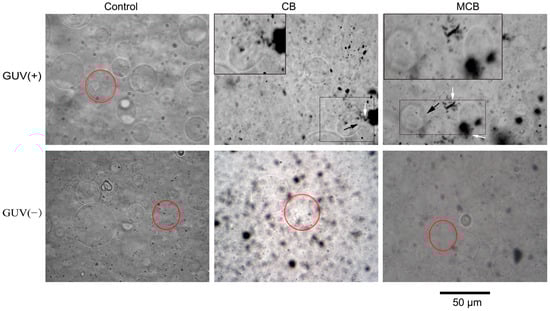 Microscopic images of GUV+ exposed for 1 h and GUV− exposed for 12 h in low-concentration CB and MCB suspension. Inserts, magnified views of boxed areas. Red false color lines added to highlight the intact lipid bilayer. Black arrow indicates the deformed GUV. White arrow indicates the phospholipid fragments extracted by NPs.