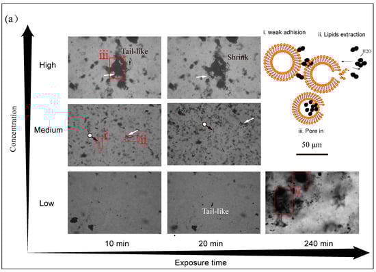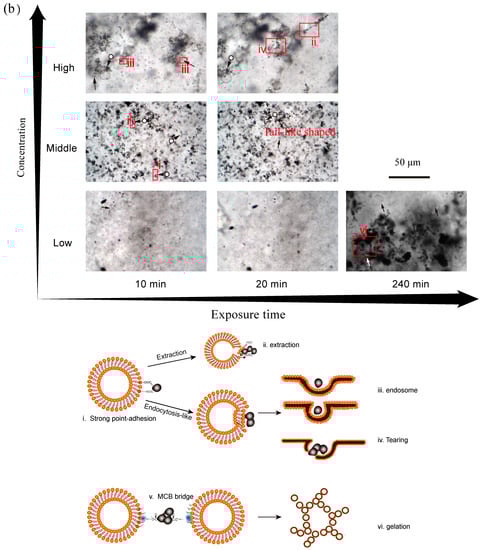 The phospholipids that assemble GUVs consist of a hydrophobic tail and a hydrophilic head with charge. Firstly, the overall hydrophobic CBNs aggregate toward the surface of the overall hydrophobic biomembrane under the electrostatic interactions, hydrophobic interactions, and strong van der Waals attraction from lipids (Figure 5(i)). MCB surface polarization accelerates the process of binding to the hydrophilic head and increases the potential for chemical bond formation. Secondly, biochemical processes such as phospholipid extraction (Figure 5(ii)) and endocytosis (Figure 5(iii)) occur at the nano–biofilm interface. Lipid extraction is an appealing mechanism that has been well applied to graphene nanosheets, as claimed by Tu et al. []. Graphene with a narrow edge (thickness ~1 nm) breaks through the obstacles of the head group and inserts into the membrane bilayer facilitated by the dispersion interaction between the sp2 region of graphene and lipids. Once inserted into the phospholipid bilayer, graphene will stay in the hydrophobic region of the phospholipid bilayer to form a hydrophobic track allowing the hydrophobic tail of lipids to climb up along them. The hydrogen bond between H2O in media and the head group of lipids is the driving force to overcome the electrostatic interaction (~800 kJ/mol) between the extracted lipid and the piled lipids []. For CB and MCB, we infer that the enveloped mode that triggers the extraction is “point-in” due to the surface roughness of the stochastic shape CBNs rather than the edge-in for graphene or pierce-in for CNTs (Figure 5b, Middle and High). In addition to phospholipid extraction, an endocytosis-like process can occur when the adsorption energy is high enough. The difference is that CB is wrapped after enough phospholipids extraction to create large voids (Figure 5a(iii)) while MCB passes directly because of relatively small DH and strong bonding energy (Figure 5b(iii)). NPs partially enveloped into the vesicles can lead to the tearing of the vesicles (Figure 5b(iv)) []. Similarly, when the tendency of the vesicles to deform and shrink exceeds the hydrophobic attraction for the arrangement of phospholipid molecules, the vesicles can tear and produce phospholipid fragments []. MCB-mediated gelation of GUV+ is a critical finding in this study (Figure 5b(v)). MCB draws the neighboring GUVs+ close by its adhesive function group “hands” and increases their regional density. Finally, the membrane is damaged by a synergistic effect of lipids extraction, shape shrink, mechanical tearing, and collective gelation when the exposure time and concentration are raised.