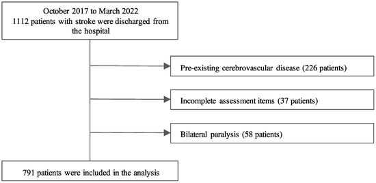 This was a single-center cross-sectional study. Patients admitted to the recovery phase rehabilitation wards of Ukai Rehabilitation Hospital between October 2017 and March 2022 were included. Patients with first-episode stroke admitted for rehabilitation, those hospitalized for at least 1 month, and those assessed on admission and discharge were included in the study. Patients with pre-existing cerebrovascular disease or bilateral motor paralysis were excluded. Patients who were transferred or readmitted to the hospital and those who did not complete the assessment items were also excluded (Figure 1). In total, 791 patients were included in the analysis after excluding those who met the exclusion criteria. In addition to assessment at admission and discharge, patients were assessed every month after admission during their hospital stay. All patients in this study underwent rehabilitation programs administered by physical, occupational, and speech therapists. Rehabilitation programs were based on a comprehensive approach and included physical, occupational, and speech therapies. Patients were provided with 6–9 units (1 unit: 20 min) per day, as necessary.
