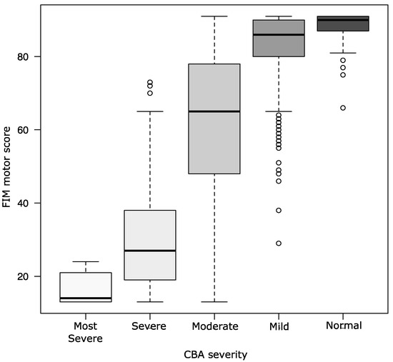 ADL ability score according to CBA severity. Summary data of FIM motor score, according to CBA severity: score of 30–29 indicating normal severity, 28–23 indicating mild severity, 22–17 indicating moderate severity, 16–11 indicating severe severity, and 10–6 indicating most severe severity. Data are represented as boxplots with median, min, and max values. The difference in FIM motor score was observed in all groups (Bonferroni correction to adjust for multiple comparisons). FIM—Functional Independence Measure; CBA—Cognitive-related Behavioral Assessment.
