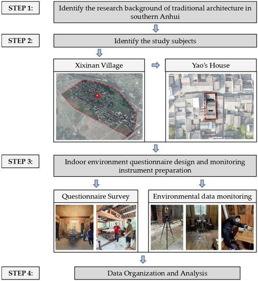 This paper consists of four steps (Figure 1). First, the basic background information of existing traditional villages in Huangshan City is summarized and investigated by reading literature and other methods (Step 1). Secondly, according to the main gathering villages of traditional dwellings, the ancient village of Xixinan, Huizhou District, Huangshan City, Anhui Province, China, and a typical traditional residence located in the village, “Yao’s House”, are selected as the objects for monitoring the indoor environment data of traditional dwellings. Step 3: Conduct the actual survey, field measurement, and questionnaire survey on the existing traditional dwellings in Xixinan Village, and finally, analyze and make statistics on them by using several evaluation indexes, such as APMV, indoor light intensity, and daylight factors. See details in Section 2.3, Section 2.4, Section 2.5 and Section 2.6.