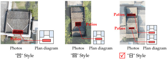 This paper selects the ancient village of Xixinan, which is located in the Huizhou District of Huangshan City, as the research object. Xixinan Village was built in the Tang Dynasty, with a history of more than 1200 years, and the village now has more than 10 well-preserved Ming Dynasty buildings and more than 100 Qing Dynasty dwellings, which is a typical gathering village of traditional dwellings in southern Anhui [45]. The traditional houses in Xixinan Village are usually compact in group layout, with wooden beams and columns as the main load-bearing structure and brick, stone, and earth as the main wall materials. According to the location and layout of the patio, there are three types (Figure 3): “凹” style, “回” style, and “日”. In this study, the “Yao’s House” in Xixinan Village was selected as the object of real-time monitoring of indoor environmental data, and its unique “日” shape layout is a typical layout of traditional residential buildings in southern Anhui [46,47,48]. The dwellings face north and south, with an axisymmetric layout, 9 m in width and 23.3 m in depth. There are two patios of different scales in the dwelling, which are relatively intact and representative of the study.