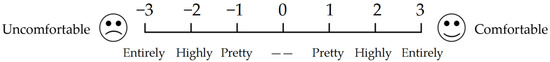 The research questionnaire is shown in the appendix. The seven-point scale specified in Appendix E of ASHRAE-55 (Figure 4) was used to evaluate subjective human comfort under different environmental factors. The range of environmental comfort evaluation was from −3 to 3 [50]. To achieve a stable state, all respondents sat in their rooms in a relaxed state for at least 15 min while conducting the questionnaire.