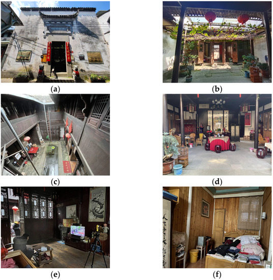 Photographs of the interior of the “Yao’s House”. (a) Building front elevation. (b) Front patio. (c) Hall. (d) Rear patio. (e) Rear hall. (f) Bedroom.