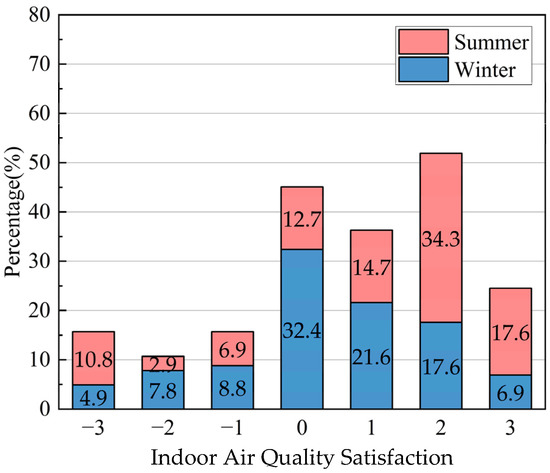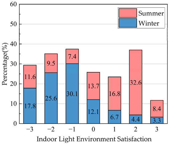Based on the consequences of the indoor light environment questionnaire, the proportion of respondents who rated it as the comfort level in winter (14.4%) was much lower than that in summer (57.0%), which indicates that the indoor light environment in summer was better than that in winter (Figure 12).