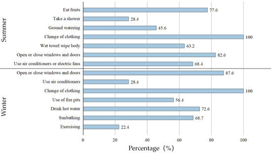 Due to the harsh natural environment, economic conditions, as well as daily living habits of the residents, the heat adaptation behavior of the respondents in Xixinan Village was different from that of residents in other areas. The data from Figure 8 show that respondents in summer and winter were different in thermal adaptation behaviors and usage proportion. When the outdoor climate changes, respondents will replace their clothes as their primary choice to adjust their thermal comfort status. Residents also adopt adaptive behaviors, such as opening and closing doors and windows, drinking hot water, and sunbathing. Because of high operating costs, more than half of the respondents said they only use air conditioners and other equipment to regulate indoor temperature in summer.