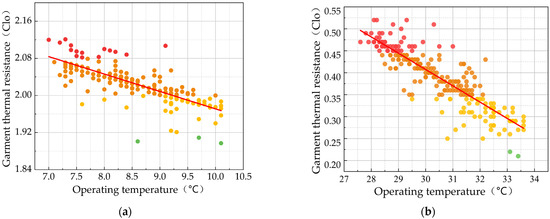 Relationship between the indoor operating temperature and thermal resistance of clothing in traditional residential houses in Xixinan Village. (a) Winter. (b) Summer.