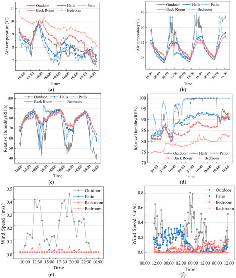 The air temperature variation in the house was closely related to solar radiation, and the variation trend of air relative humidity at each measuring point was opposite to that of air temperature (Figure 10). The bedroom faces north so as not to be directly exposed to the sun, and the temperature fluctuates less throughout the day. Its average temperature in winter is 1.8 °C higher than the outdoor measuring point, and in summer, it is 2.6 °C lower. Because the air exchange in the bedroom relies primarily on a small window opening onto the interior patio, resulting in its small effective ventilation area, the room is often breezy or still. Hence, it averages over 75% humidity in winter and summer, exceeding the comfortable temperature and humidity range. The temperature and humidity of the other four measuring points were affected by solar radiation, and the changes were drastic. Compared with other indoor spaces in the dwellings, the patios were continuously exposed to direct sunlight during summer, and the average temperature continued to rise. At the same time, the highest temperature on the patios was 39.6 °C, second only to the outdoors. Although the sun’s radiation accelerated the evaporation of water vapor in the patios, the air humidity was still above 75%. In winter, due to the occlusion formed by the overhanging eaves, the patios were less exposed to direct sunlight. With the increase in the midday solar radiation, the vertical wind pulling effect of the patios strengthened the thermal pressure ventilation effect, and the patios became the main ventilation path, which resulted in a relatively severe heat loss of the house. In addition, the average temperature of the patios in winter was the lowest among the monitoring points, only 7.7 °C.