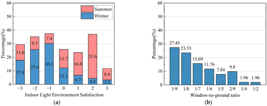 Results of the questionnaire survey on the indoor light environment of traditional houses in Xixinan Village. (a) Satisfaction distribution of indoor light environment. (b) Comparison of indoor windows and floor space in traditional residential houses.