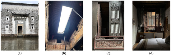 Anhui Province (Figure 2) is located in China’s hot summer and cold winter zone, and due to its topography and other conditions, it is divided into three regions: southern, central, and northern Anhui, each of which has its climate characteristics [39,40]. Among them, the characteristics of hot and high humidity, cold and damp, are the most obvious in southern Anhui, and its comprehensive demand for heat, cold, and humidity prevention is stronger [41]. In addition to Xin’an River, there is also Qingge River, which originates from the northern slope of Huangshan Mountain, and there are Huangshan Mountain, Qiyun Mountain (Baiyue), and its remaining veins, which is a mountainous area called “eight mountains and one water and one field” [42]. The Huizhou traditional houses located in the southern part of Anhui reflect the characteristics of the mountainous area, feng shui will, and the tendency of regional beauty decoration, and their structure is the same. There are multiple courtyards inside the residences. Folk houses generally sit on the north to the south, according to the terrain built [43]. The layout of traditional houses in Huizhou is the same, with symmetrical distribution in the central axis. The courtyard in front of the hall is called “Patios”, which has the function of lighting and ventilation and has the auspicious meaning of “four waters return to the hall” [44].