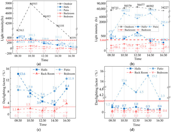 The interior light environment in “Yao’s House”. (a) Front and rear elevation; (b) patios; (c) windows; and (d) bedroom.