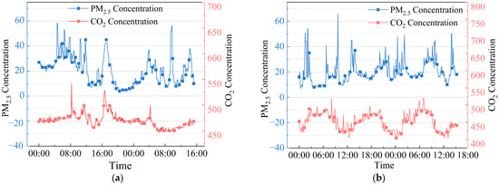 The CO2 concentration generated by human activities is often used to characterize the freshness of indoor air’s freshness or ventilation strength. The content of PM2.5 per cubic meter of air represents the degree of air pollution [52]. Therefore, PM2.5 and CO2 concentration distribution are used to evaluate indoor environmental quality comfort.
