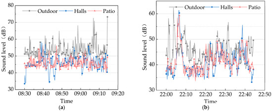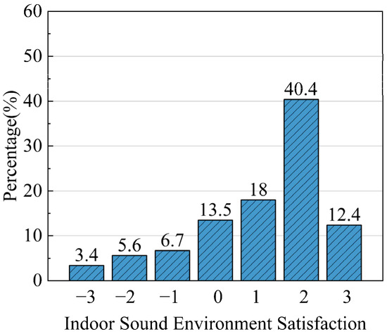 Noise is a subjective evaluation standard. That is, all the sound that affects others is noise [53]. Because the results measured by A-weighted sound pressure are similar to the human ear’s perception of the loudness of sound, A-weighted sound pressure level is one of the most widely used indicators in noise measurement in the world. It became one of the main indicators for evaluating indoor environmental noise in the International Organization for Standardization and most countries [54,55,56]. Previous studies found that the equivalent continuous A-weighted sound pressure level (LAeq) is strongly correlated with sound comfort, so the noise evaluation index in this study is LAeq [57,58].