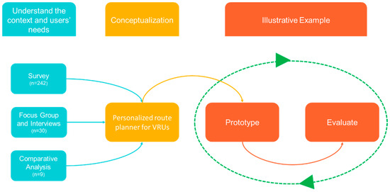 To determine how the proposal could be implemented and adopted, a set of User-Centered Design (UCD) methods focused on evaluating user needs were employed. The concepts of usability and user experience (UX) were also integrated into the evaluation of the prototype to ensure that the technology and services being developed were accessible to all users. The methodological approach used to conceptualize the proposed route planner is illustrated in Figure 1. The following section outlines the methodological approach taken and the main results obtained. The proposed concept is then introduced.