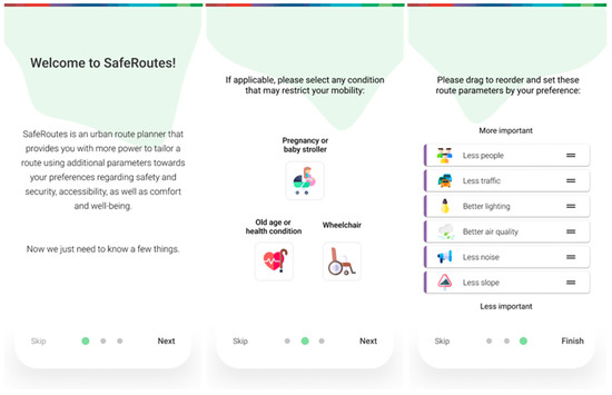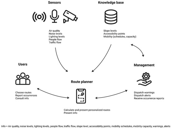 On a mobile device, the route planner can calculate and present personalized routes, as well as information on the aforementioned parameters from the sensors and knowledge base. The route calculation takes into account the preferences indicated by users in terms of safety, security and comfort parameters and sensor and knowledge-based data. The intersection between these two will allow the route planner to indicate optimized and personalized routes for each individual. The advice provided will be optional and not mandatory, and tasks should be clearly defined, short, and easy to learn to maximize interest and encourage future adoption from potential users.