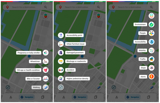 The home screen should be familiar to those using route planner/navigation applications, featuring three distinct buttons in the left and right lower corners and the top right corner (Figure 5). The lower right button changes the way the user moves around. Options are walking, bike/scooter, and three types of conditioned mobility which may include old age or health condition, wheelchair usage, and being pregnant/using a baby stroller. Each selection will imply, favor or condition the routes to be presented regarding their associated parameters.