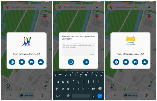 The lower left button allows a user to report a selection of temporary events that may be of interest to other users. Users can pinpoint places with unusual pedestrian density, accidents, blockages or roadworks, damaged pavement, and issues with urban furniture and mark accessibility points for those who need them most (as they are missing from most route planners). They can associate a picture or a small description with their report, which, when submitted, will be available in a specific section for other users to consult (Figure 6).