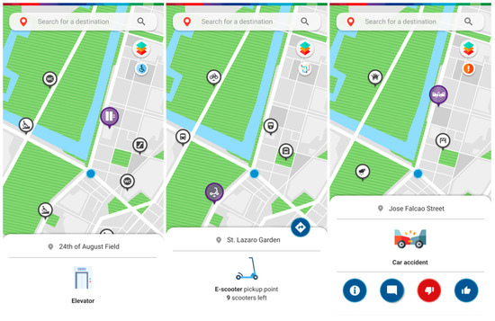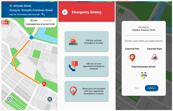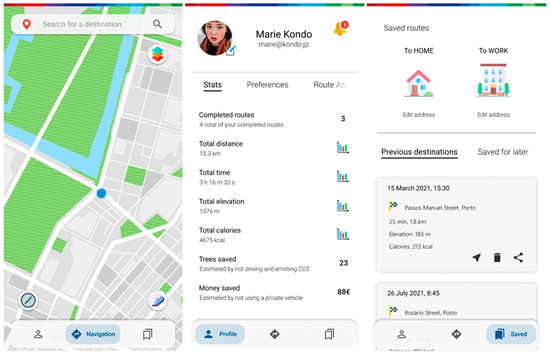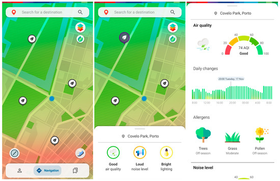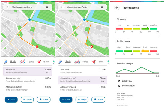 The developed mobile application allows planning a trip using active modes of transport and taking into account personal preferences in terms of safety, security and comfort. Thus, the routes suggested by the application are customized to the users’ preferences to maximize their perception of safety, security and comfort. The routes can be calculated using, for example, an A-Star algorithm, considering individual preferences for each parameter and the real values of that parameter, which allows one to obtain a specific set of weights per person, returning the corresponding route [48]. The application also makes it possible to query information passively, with users being able to access information such as air quality or noise level at a certain point in the city. These and other functionalities of the application are presented below, accompanied by some screenshots of the developed prototype. Finally, this section concludes with the presentation of the tests conducted to evaluate the prototype.