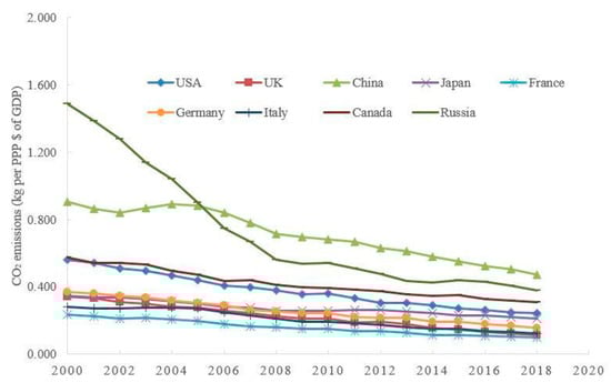 The trends of CO2 emissions per GDP of selected countries. Source: https://data.worldbank.org/indicator/EN.ATM.CO2E.PP.GD, accessed on 22 October 2022.