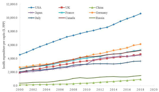 The trends of health expenditure per capita of selected countries. Source: https://data.worldbank.org/indicator/SH.XPD.CHEX.PP.CD, accessed on 22 October 2022.