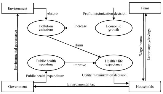 However, the endogenous relationship among environmental governance, public health, and economic growth may be more complex than that shown in Figure 1, Figure 2 and Figure 3. The reasons may be as follows. First, pollution emissions have a dual impact: on the one hand, pollution emissions reflect the short-term performance of the energy-dependent economy; on the other hand, the increasing pollution emissions aggravate the long-term policy costs of environmental regulation. Second, the health damage caused by pollution may also have dual effects: on the one hand, the health damage means that residents have to increase the cost of childcare for their children; on the other hand, government departments also need to increase the public health expenditure caused by pollution emissions. Although this endogenous relationship has attracted the attention of some scholars [3,4], there are still some outstanding issues worth pondering. First of all, under the irreversible trend of population aging, how will the above endogenous relationship change? Secondly, behind the balance between environmental pollution and economic growth, is there a balance between environmental governance and health improvement? Finally, when analyzing the effects of environmental policies, how do we evaluate the cost of these policies?