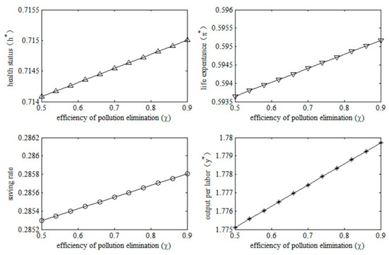 Proposition 4 states that the government can also affect private saving rates by changing the environmental tax rate. As private savings are an important source of physical capital, Proposition 4 can be regarded as a micro-explanation for the impact of environmental tax rates on physical capital per labor unit (proposed in Proposition 1). However, public health expenditure will not always increase the private saving rate. From Proposition 3, we highlight that the increase in the fraction of public health expenditure will increase the private saving rate only under the condition of a lower environmental tax rate (), and that the increase in the fraction of environmental protection expenditure will increase the private saving rate only in the condition of a higher environmental tax rate (). Therefore, Proposition 4 can be regarded as a micro-explanation for the impact of the fraction of public health expenditure on physical capital per labor unit proposed in Proposition 2.