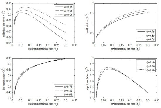 From Proposition 1, we highlight that the existence of an optimal environmental tax rate is based on some conditions. Proposition 1 also suggests that we can obtain the optimal environmental tax rate with respect to , and through a similar method. It should be noted that the optimal environmental tax rate for , , and may not be the same. Hence, the government may be faced with trade-offs when changing the environmental tax rate.