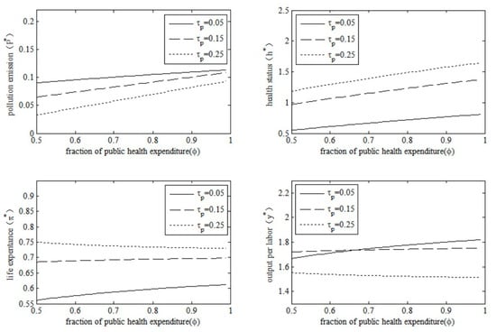 Proposition 3 suggests that the government can affect life expectancy by changing the environmental tax rate. Therefore, environmental governance is conducive to controlling the adverse effect of pollution emissions on life expectancy. However, public health expenditure will not always improve the survival probability of old individuals. From Proposition 3 we highlight that the increase in the fraction of public health expenditure will improve life expectancy only under the condition of a lower environmental tax rate (), and that the increase in the fraction of environmental protection expenditure will improve life expectancy under the condition of a higher environmental tax rate ().