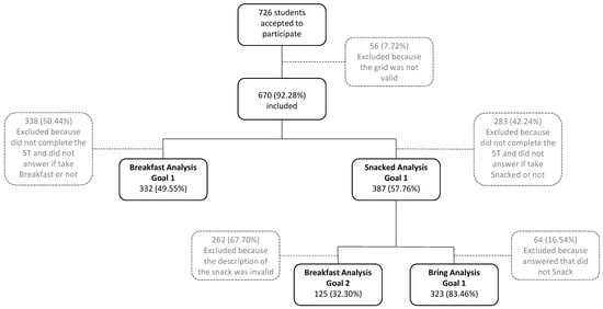 Flowchart of the participants’ inclusion/exclusion process for each study goal: breakfast consumption, snacking, and bring analysis (i.e., where the snack was acquired) for the first goal; qualitative analysis for the second goal (black boxes refer to the participants included in the study, and the grey ones refer to participants excluded from the study).