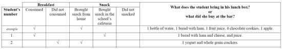 An observational grid was used to evaluate the student’s breakfast and snacking patterns and quality during the school year (see Figure 2). The following topics were asked on the observational grid: (i) if students had breakfast; (ii) if students snacked; (iii) if the snack was brought from home, bought in the school’s cafeteria, or both; and (iv) identification of the content of the student’s snack. Note that the topic regarding breakfast consumption was only included from T2 onwards after an update of the literature review.