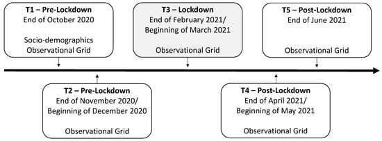 According to the goal of understanding the changes in students’ breakfast and snack consumption pre- during, and post-second lockdown, the present study followed a longitudinal design with five moments. Figure 3 summarizes the five moments (T1–T5) of data collection. Note that the goal of the study was to analyze patterns of change across a school year characterized by several restrictions due to the pandemic (e.g., social distancing). To this purpose, we decided to conduct a five-wave longitudinal study. Coincidently, a lockdown occurred around the third moment (T3) of data collection, which allowed us to understand the impact of this public health measure on students’ behavior.
