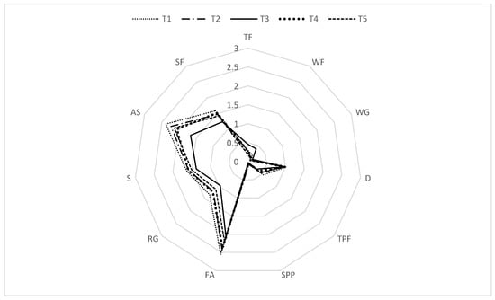 Graphic for the HEI components consumed among moments. Each angle of the graphic represents a distinct component (i.e., TF—Total Fruits, WF—Whole Fruits, WG—Whole Grains, D—Dairy, TPF—Total Protein Foods, SPP—Seafood and Plant Protein, FA—Fatty Acids, RG—Refined Grains, S—Sodium, AS—Added Sugars, SF—Saturated Fats), and a distinct line represents each moment. Unity of measures = portions.
