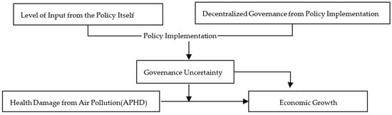 Currently, few references have studied the relationship between APHD, governance uncertainty, and economic growth. Some scholars believe that the strict implementation of relevant APHD policies can promote economic growth from an overall governance perspective [,,]. Other scholars believe that the implementation of relevant APHD policies will affect investment decisions in heavily polluted areas and hinder local economic growth []. Further from the perspective of joint prevention and control of governance, scholars believe that joint prevention and control policies can effectively alleviate the negative effects of pollution on economic growth, although air pollution inhibits economic growth [,]. Joint Regional Air Pollution Prevention and Control System (JPCSRAP) can achieve a win-win outcome for both the environment and the economy, namely reducing air pollution while achieving economic growth [].