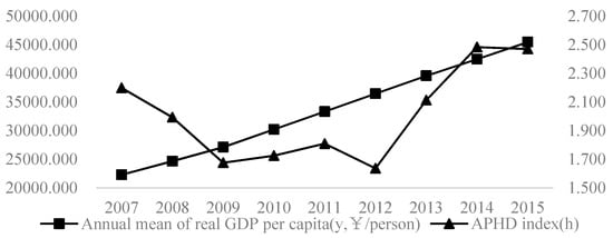 Meanwhile, traditional economics believes that environmental pollution is characterized by null jointness, which is the product of extensive economic growth; that is, serious environmental pollution is often accompanied by high-level economic growth, and the null-jointness effect is also suited to air pollution. In order to avoid the single impact of air pollution on economic growth, this paper chooses the coupling index h of the air pollution system and the health damage system (APHD) to analyze, considering the health damage effect. Further, in order to fit the development strategy of promoting the construction of “healthy China” and highlight the important role of healthy human capital, the comprehensive index system and principal component entropy weight method are adopted to measure the APHD index (h) []. Moreover, Figure 2 shows the development trend of APHD calculated by the annual mean value of health damage estimated by air pollution from 2007 to 2015. In Figure 2, there is a fluctuating trend of decline first and then increase from 2007 to 2015 in China. Among them, the rise of APHD before 2014 was mainly due to the rapid growth rate of APHD in eastern China. However, after 2014, the decline of APHD was due to the decline in western China.