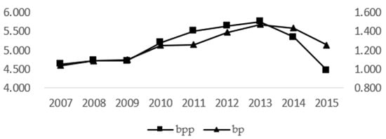 Among them, bp and bpp both represent the uncertainty of governance. The difference between them is that they are endowed with weights expressed by different levels of prevention and control decentralization. They can be regarded as proxy variables for robustness tests. proex represents the amount of investment in governance; bxt1 and bxt2 refer to the decentralization level of prevention and control delegated to the municipal level and the county level, respectively. The decentralization types of pollution control include fiscal decentralization, territorial jurisdiction decentralization, and economic decentralization []. The level of decentralized governance discussed in this paper is the comprehensive level of decentralized governance, namely: