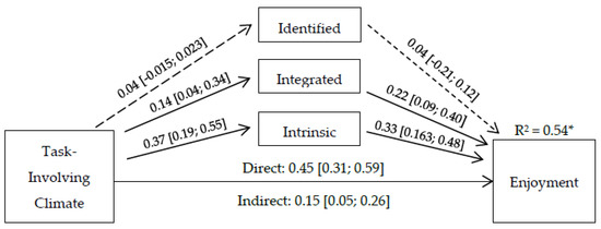 According to the results of the mediation analysis, task-involving motivational climate displayed a positive and significant association with integrated regulation and intrinsic motivation. In turn, these behavioral regulations are positive and significant predictors of enjoyment in the context of football practice. These associations are supported by theoretical and empirical evidence [11,27,30]. More specifically, the Achievement Goal Theory theorizes key aspects of motivation at the contextual level, since this model suggests that contextual factors such as interpersonal behaviors provided by coaches that are less evaluative and more supportive to the intrinsic desire to learn may promote improvements in achieving the desired competence and goals of adolescents [11]. In fact, the task-involving motivational climate and its attributes, in which learning and personal progress are accepted, effort is rewarded, and errors are acknowledged as a normal part of the education process, are very similar to sports pedagogy approaches commonly used in youth training [47]. Furthermore, during adolescence, there are pubertal fluctuations, incipient ability to think about oneself, changes in different roles and responsibilities, as well as personality development. Thus, the motivational climate created by the coach could be understood as a crucial factor that functions to normalize and increase well-being and enjoyment throughout these adolescent years and act as a promoter of sport practice [29]. Therefore, our results are in line with those of prior studies that showed that athletes who perceive that their coaches create a task-involving motivational climate exhibit more self-determined motivational patterns [27] and thus, consequently, a greater perception of enjoyment [23].