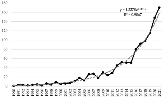 Number of Scopus [4] papers on healthcare expenditure and sustainable growth published during 1990–2021.