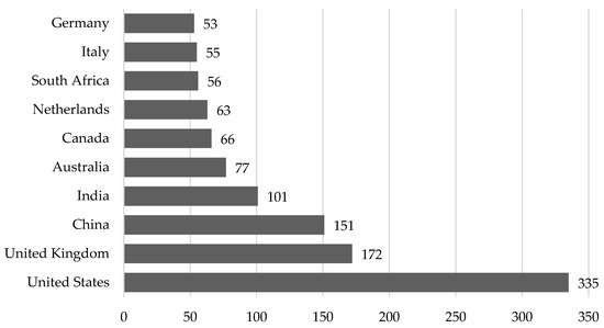 According to Figure 2, it can be noted that leadership in the study of the relationship between the financing of the healthcare system and sustainable development is held by the USA, whose researchers published 335 publications on the topic during 1990–2022. Scientists from the United Kingdom, China, and India also have a high level of publication activity. At the same time, researchers from Australia, Canada, the Netherlands, South Africa, Italy, and Germany have approximately the same number of publications.