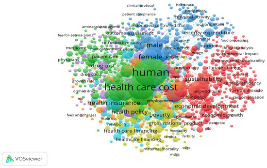 Figure 3 reflects the co-occurrence between the key concepts that scientists highlight in their research to study the relationship between healthcare expenditure and sustainable growth.